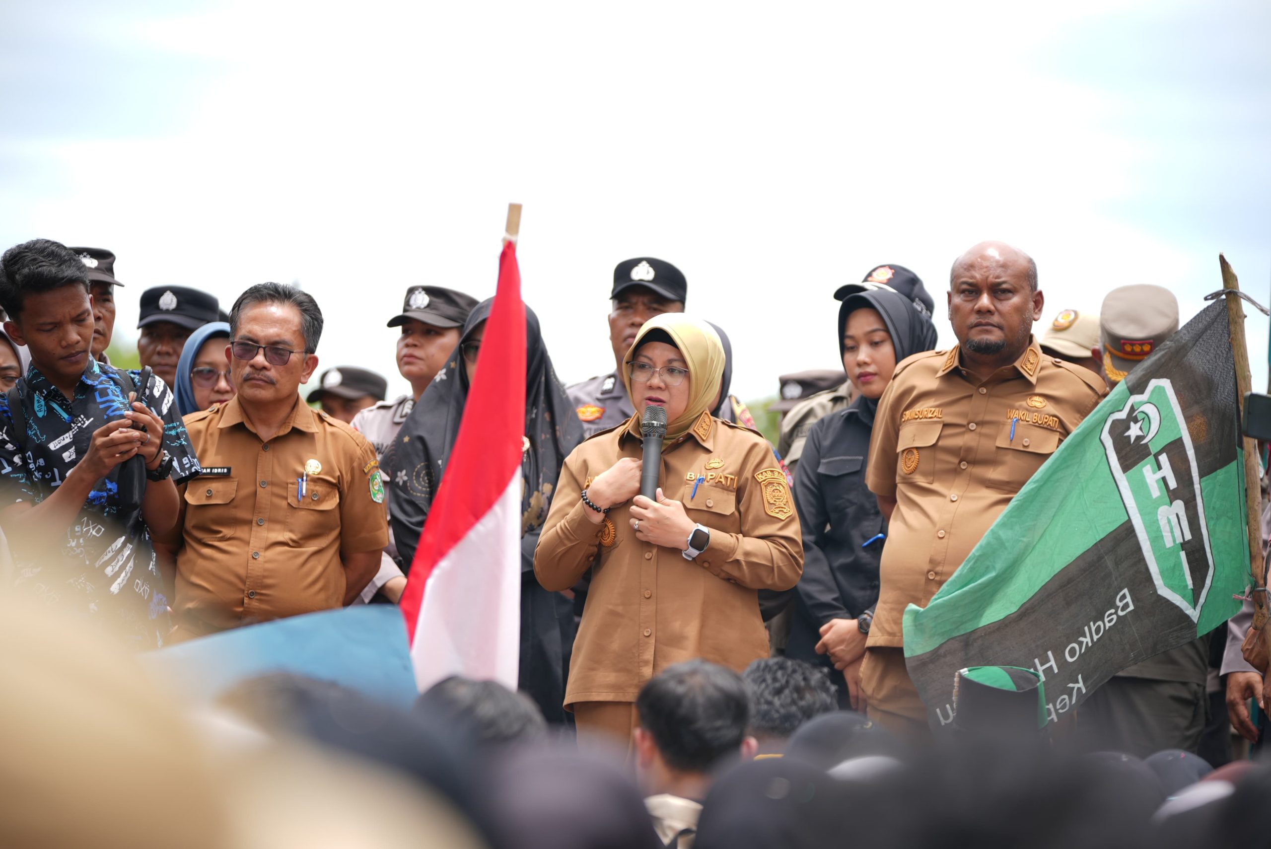 Aksi tersebut di tanggapi langsung Bupati Siak, Afni Zulkifli, bersama Wakil Bupati, Syamsurizal, yang turun menemui para mahasiswa.