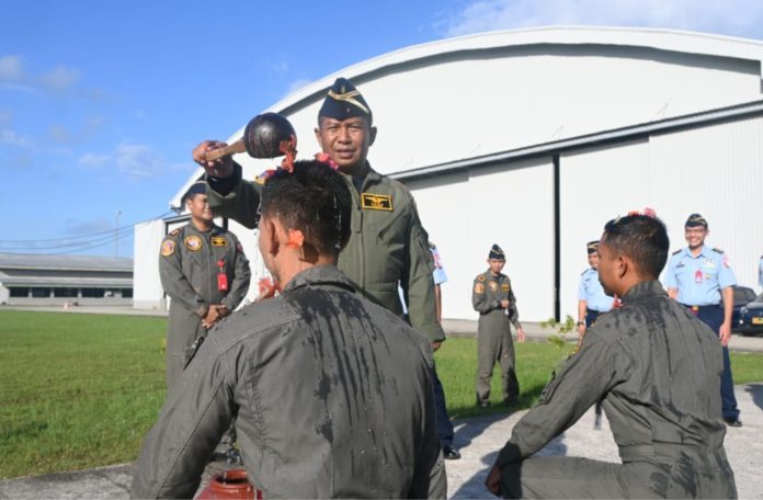 Kegiatan berlangsung di Shelter Skadron Udara 52, Lanud RSA, Kabupaten Natuna, Provinsi Kepri, Rabu (3/12/2025), sebagai penanda berakhirnya program transisi penerbang bagi perwira muda TNI Angkatan Udara.