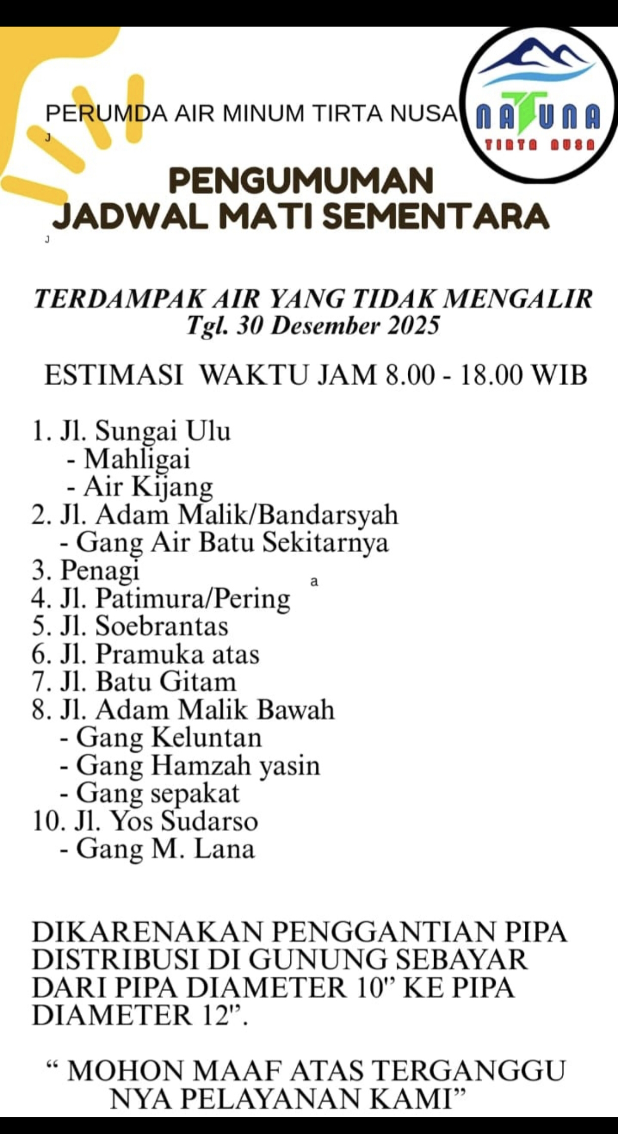 Natuna — Perumda Air Minum Tirta Nusa Kabupaten Natuna mengumumkan terjadinya penghentian sementara aliran air bersih di sejumlah wilayah pada Selasa, 30 Desember 2025, mulai pukul 08.00 hingga 18.00 WIB.