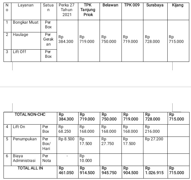 Berikut perbandingan tarif bongkar muat di pelabuhan sejenis :