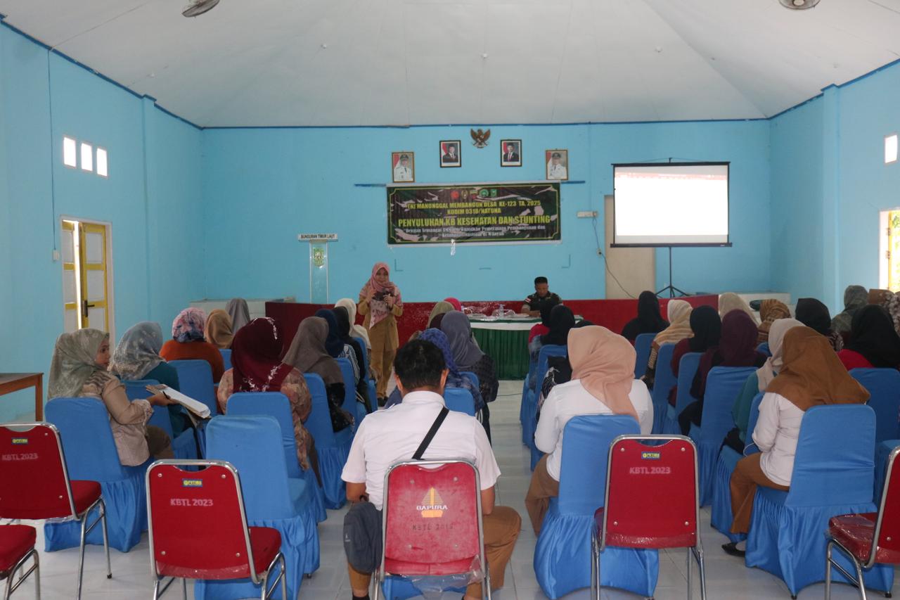 Natuna – Dalam rangka mendukung pemerataan pembangunan dan memperkuat ketahanan nasional, Komando Distrik Militer (Kodim) 0318/Natuna menggelar penyuluhan tentang Keluarga Berencana (KB), kesehatan, dan pencegahan stunting bagi masyarakat Bunguran Timur Laut.