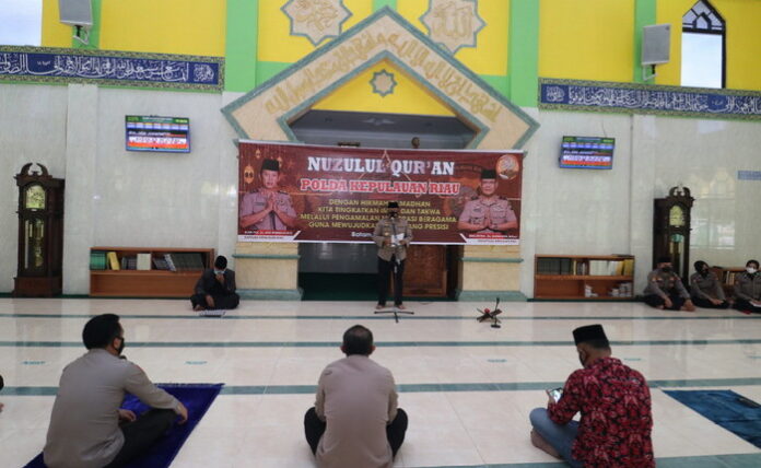 Bursakota.co.id, Batam – Peringatan Nuzulul Quran di Masjid Al- Halin Polda Kepri mengangkat tema ″Dengan Hikmah Ramadhan Kita Tingkatkan Iman dan Takwa Melalui Pengalaman Moderasi Beragama Guna Mewujudkan Polri Yang Presisi″, Jumat (30/4/2021).