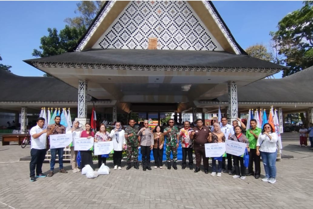 Penyerahan diberikan simbolis oleh Kepala Kantor BPJS Ketenagakerjaan Pematangsiantar Inggrid Maya Sari dan unsur Forkopimda yang hadir.