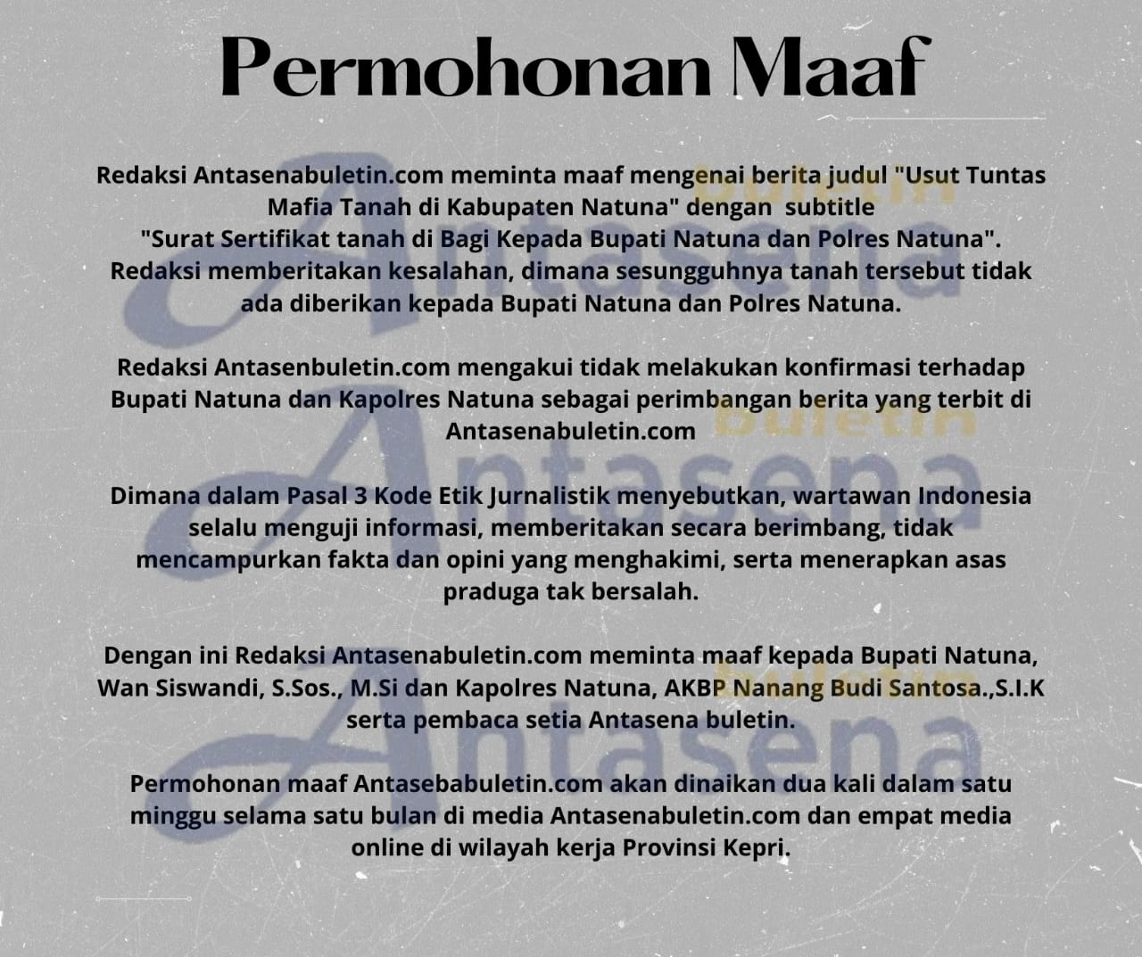 Redaksi Antasenabuletin.com meminta maaf mengenai berita judul “Usut Tuntas Mafia Tanah di Kabupaten Natuna” dengan subtitle “Surat Sertifikat tanah di Bagi Kepada Bupati Natuna dan Polres Natuna”. Redaksi memberitakan kesalahan, dimana sesungguhnya tanah tersebut tidak ada diberikan kepada Bupati Natuna dan Polres Natuna.