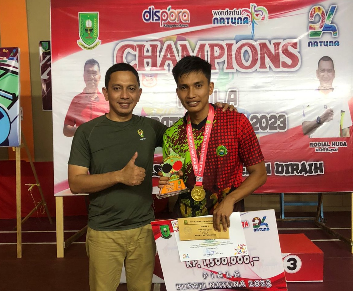 Serda M. Husni Fajri berhasil menjadi juara pertama setelah mengalahkan lawannya Wahyu Fazrul di pertandingan puncak di Gor Gemilang, Jemengan, Kecamatan Bunguran, Sabtu malam (02/10/2023).