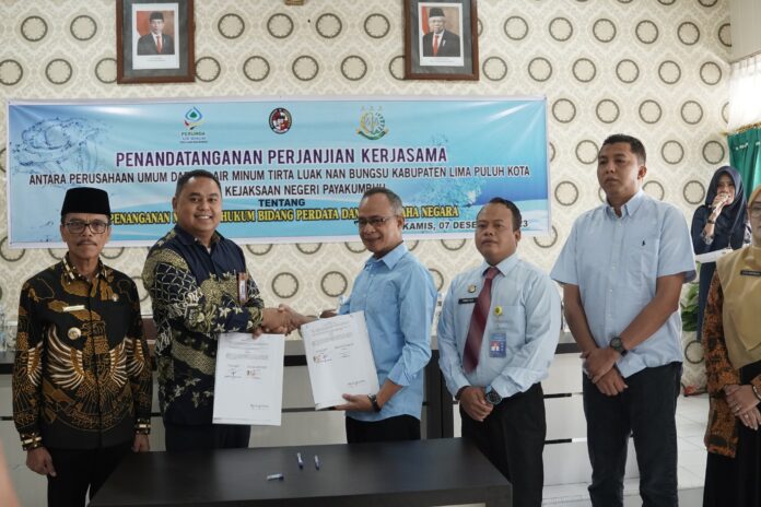 Disaksikan Bupati Lima Puluh Kota Safaruddin, penandatangan Memorandum of Understanding (MoU) antara Direktur Perumda Tirta Luak Nan Bungsu Nofrizen dengan Kepala Kejaksaan Negeri Payakumbuh Slamet Haryanto dilaksanakan di Aula Kejaksaan Negeri Payakumbuh, Kamis (7/12/2023).
