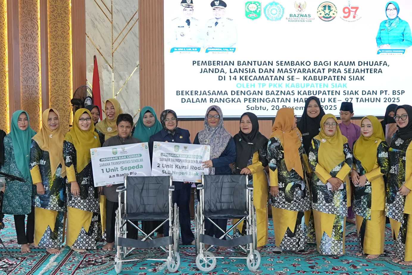 Siak – TP PKK Kabupaten Siak bersama BAZNAS Kabupaten Siak dan PT Bumi Siak Pusako menyalurkan bantuan sembako kepada kaum dhuafa, janda, lansia, serta masyarakat pra sejahtera di 14 kecamatan se-Kabupaten Siak.