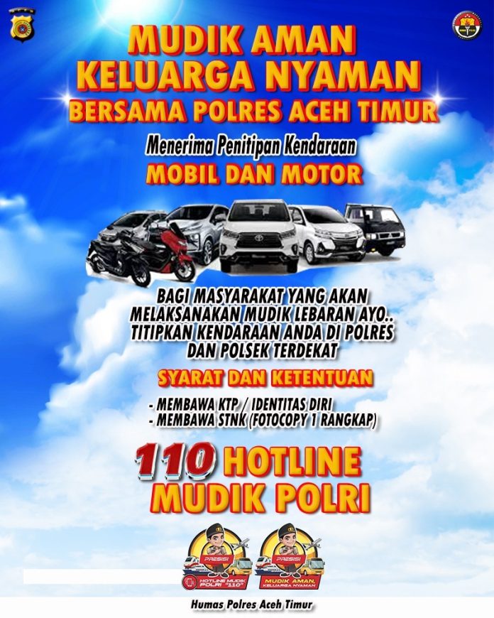 Disebutkan, pelayanan penitipan kendaraan bermotor bagi warga Aceh Timur yang ingin berpergian saat libur atau Mudik Lebaran 2025 ini bisa di Polres Aceh Timur dan seluruh polsek jajarannya. Nantinya warga yang akan mudik bisa menitipkan kendaraan bermotornya di Polres Aceh Timur atau Polsek jajaran terdekat dengan menghubungi nomor layanan yang telah disediakan ataupun datang langsung ke kantor polisi. Waktu pelayanan dibuka mulai H-7 sampai H+7 Lebaran.