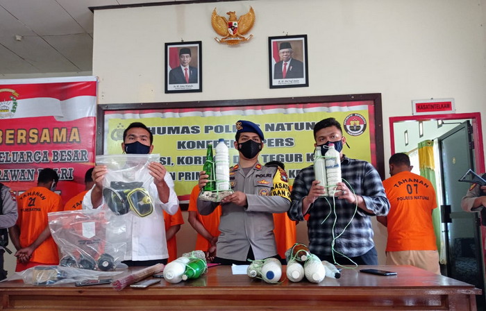 Bursakota.co.id, Natuna – Kepolisian Resort (Polres) Natuna menangkap 7 pelaku pengeboman ikan di perairan Midai, Sabtu 29 Mei 2021 sekitar pukul 10.00 WIB.