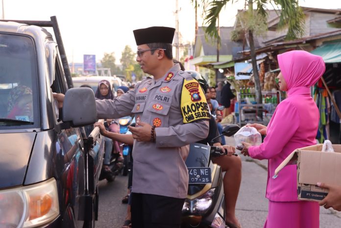 “Dengan adanya kegiatan berbagi seperti ini, harapan kita bisa membantu masyarakat yang masih beraktifitas untuk sekedar berbuka puasa,” ujar Kapolres.