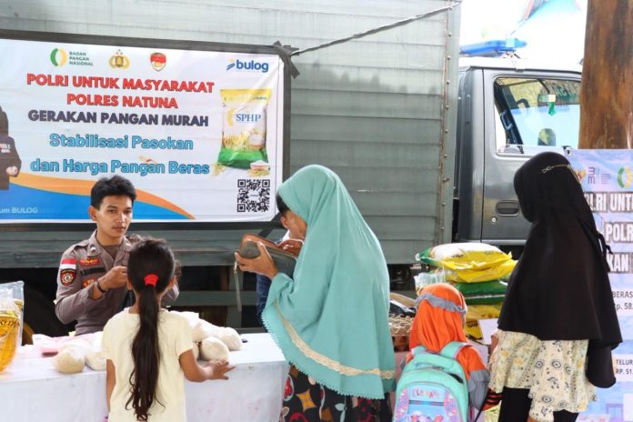Natuna – Polres Natuna bersama Perum Bulog menggelar kegiatan Pasar Pangan Murah di kawasan Tugu Gasing, Kelurahan Bandarsyah, Sabtu (27/09/2025).