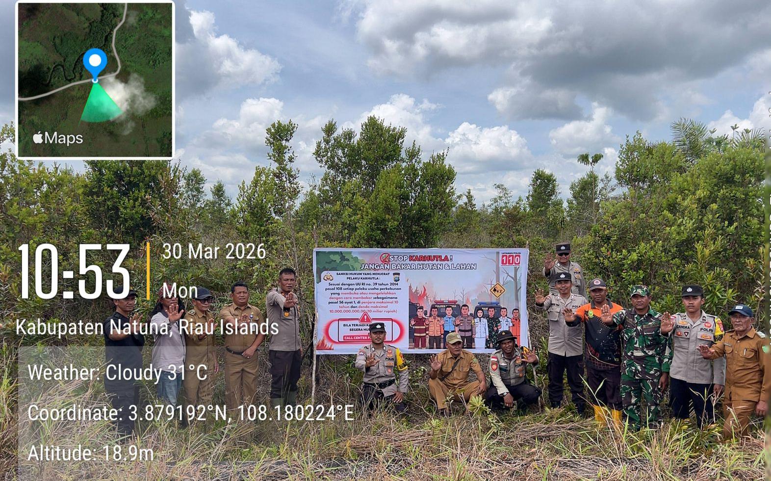 ‎Natuna – Dalam upaya mencegah kebakaran hutan dan lahan (karhutla), Polres Natuna dan jajaran Polsek bersama unsur terkait melaksanakan pemasangan spanduk imbauan di wilayah rawan terbakarnya lahan di Kabupaten Natuna, Senin (30/3/2026).