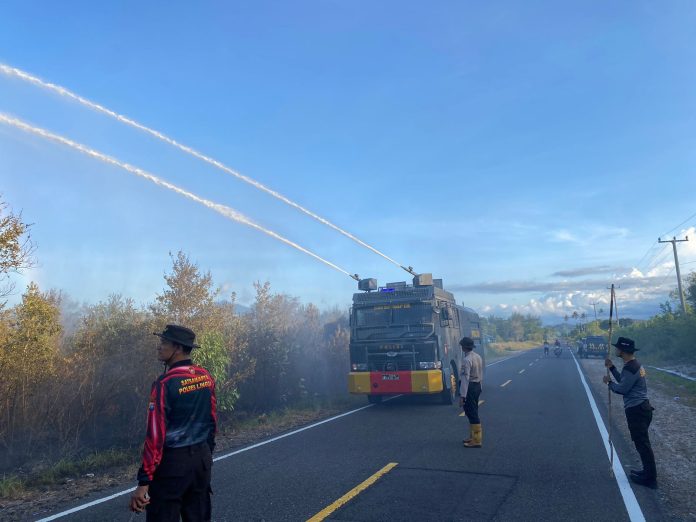 Kapolres Natuna, AKBP Nanang Budi Santosa, S.I.K, turun langsung dengan mobil watercanon untuk memadamkan kebakaran dan mengantisipasi agar api tidak meluas.