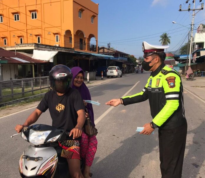 Bursakota.co.id, Natuna – Guna menciptakan situasi lalu lintas yang aman, tertib dan lancar serta upaya mencegah penularan covid-19, Satuan Lalu lintas Polres Natuna selain melaksanakan tugas rutin yaitu pengaturan lalu lintas juga melaksanakan kegiatan himbauan tertib berlalu lintas dan himbauan protokol kesehatan serta membagikan masker gratis kepada masyarakat di seputaran wisata pantai piwang Kec.Bunguran Timur, Kab Natuna, Kamis (27/01/2022).