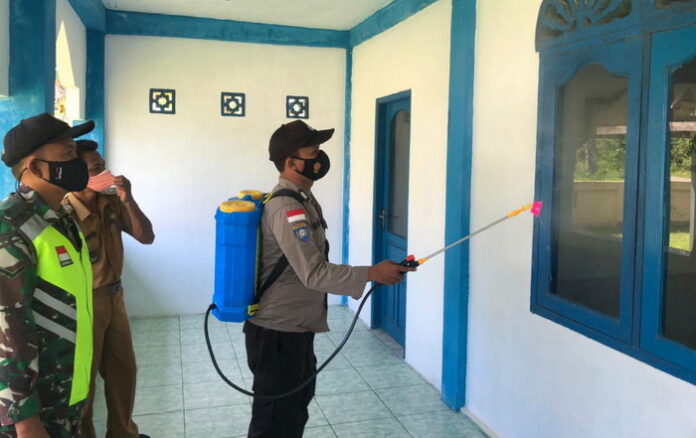 Bursakota.co.id, Natuna – Polres Natuna melalui Polsek Bunguran Timur melaksanakan sterilisasi dengan menyemprotkan cairan disenfektan di Masjid Al Huda, Pian Padang, Desa Cemaga Selatan Kecamatan Bunguran Selatan guna mencegah penyebaran Covid-19, Senin (24/05/2021).