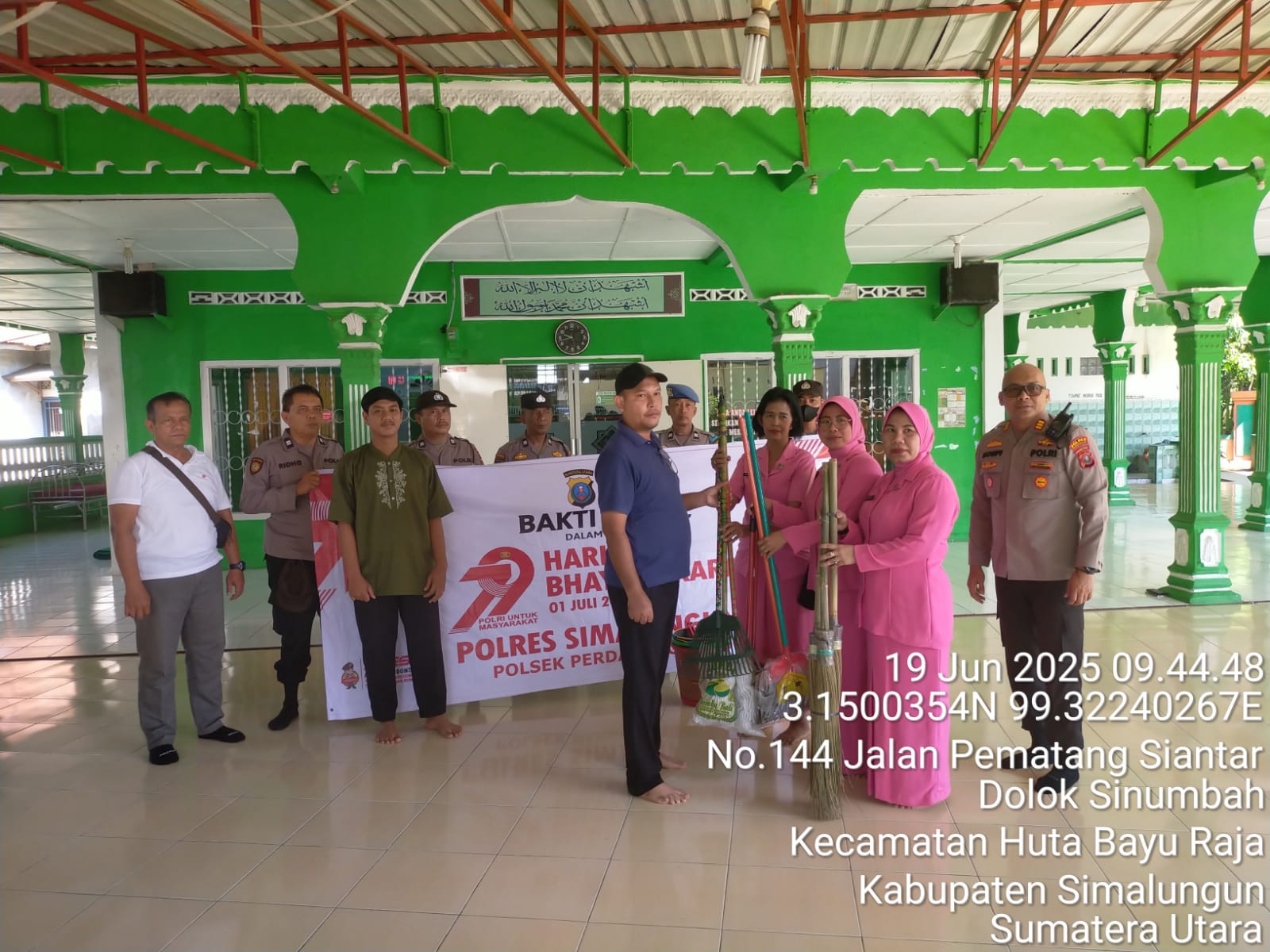 Simalungun – Polsek Perdagangan Polres Simalungun menggelar kegiatan Bhakti Sosial Religi dalam rangka menyambut HUT Bhayangkara ke-79 dengan melakukan pembersihan dan penyerahan alat kebersihan di dua masjid di wilayah Kecamatan Bandar, Kabupaten Simalungun, Kamis (19/6/2025).