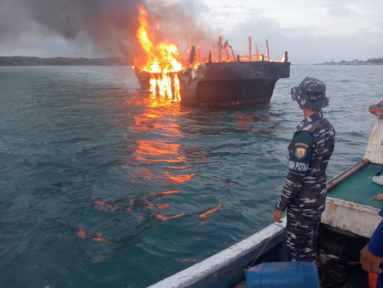 Natuna – Prajurit Pos TNI AL Subi (Posal Subi) jajaran Pangkalan TNI AL Ranai (Lanal Ranai) bantu pencarian dan evakuasi Anak Buah Kapal (ABK) KM. Lyyra yang terbakar di perairan Subi.