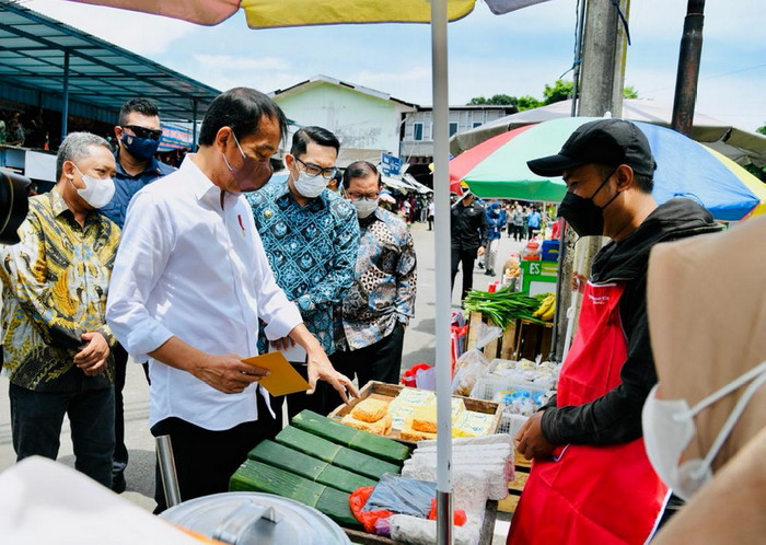 Bursakota.co.id, Jabar – Presiden Joko Widodo mengunjungi Pasar Sederhana di Kota Bandung, Provinsi Jawa Barat, pada Senin, 17 Januari 2022, untuk meninjau sekaligus memberikan bantuan tunai untuk pedagang kaki lima dan warung. Bantuan sejumlah Rp1,2 juta diberikan sebagai tambahan modal dan diharapkan bisa meringankan beban para pedagang yang terdampak pandemi Covid-19.