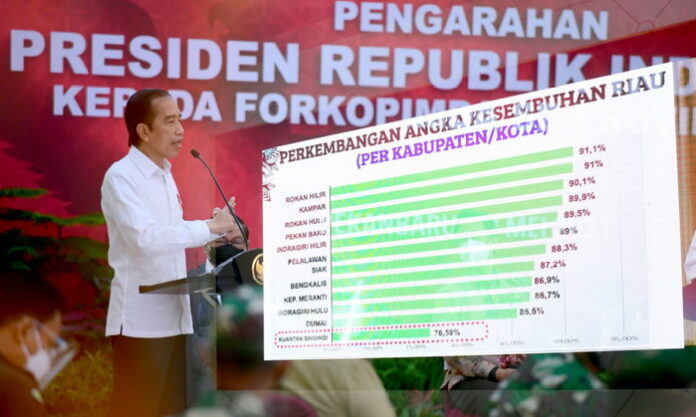 Bursakota.co.id, Kepri – Penyebaran virus korona di Provinsi Riau yang relatif meningkat beberapa waktu terakhir harus segera ditekan agar kasus penularan di daerah tersebut tidak terus berlanjut. Berkaitan dengan hal itu, Presiden Joko Widodo dalam kunjungan kerja ke Provinsi Riau pada Rabu, 19 Mei 2021, memberikan pengarahan kepada Forkopimda se-Provinsi Riau yang diadakan di Gedung Daerah Provinsi Riau, Kota Pekanbaru.