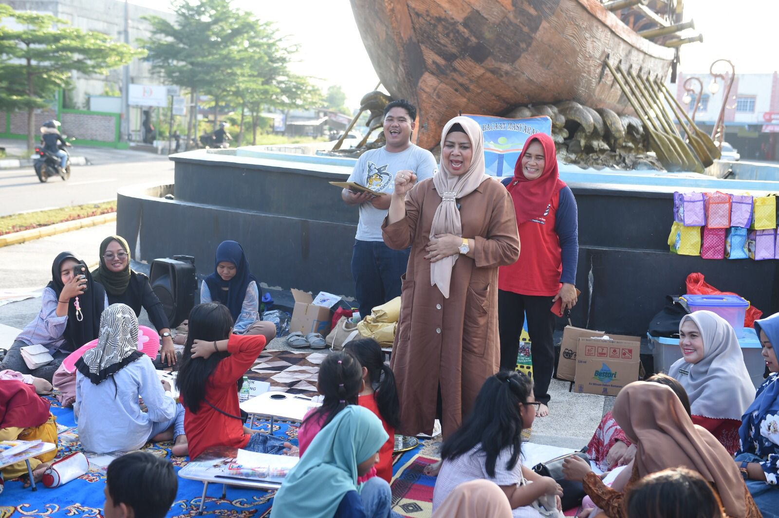 Ket Foto : Puluhan anak-anak dengan penuh canda tawa dan keceriaan ikut berpiknik bersama Bunda Literasi Kepri, Hj. Dewi Kumalasari Ansar, di bawah temaram bayangan replika Kapal Bulang Linggi, Jalan Bandara, Tanjungpinang, pada Jumat (5/7) sore.