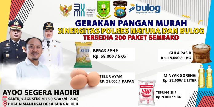 Natuna – Dalam rangka menyambut Hari Ulang Tahun Kemerdekaan Republik Indonesia ke-80, Polres Natuna bersama Perum Bulog kembali menggelar kegiatan Pangan Murah Masuk Desa. Kali ini, kegiatan berlangsung di Dusun Mahligai, Desa Sungai Ulu, pada Sabtu (9/8/2025) mulai pukul 15.30 hingga 17.30 WIB.