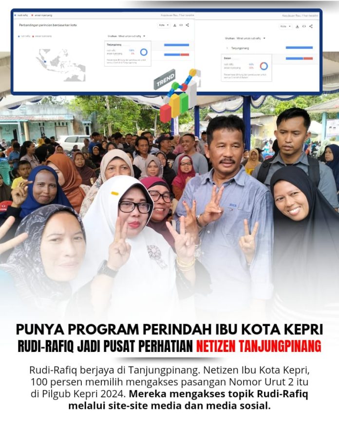 Tanjungpinang – Rudi-Rafiq berjaya di Tanjungpinang. Netizen Ibu Kota Kepri, 100 persen memilih mengakses pasangan Nomor Urut 2 itu di Pilgub Kepri 2024. Mereka mengakses topik Rudi-Rafiq melalui site-site media dan media sosial.