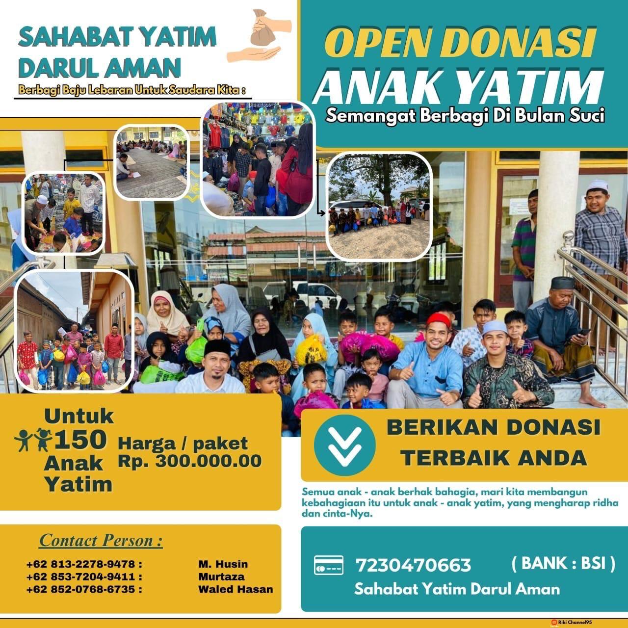 Dalam inisiatif ini, masyarakat diajak untuk berdonasi dalam bentuk uang maupun barang yang nantinya akan disalurkan langsung kepada anak-anak yatim yang membutuhkan. Bantuan dapat dikirimkan melalui rekening Bank BSI No. 7230470663 atas nama Sahabat Yatim Darul Aman. Bukti pengiriman bisa dikonfirmasi melalui WhatsApp di nomor berikut: