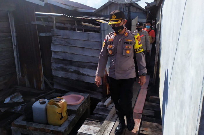 Kapolres Natuna AKBP Ike Krisnadian menyusuri rumah warga untuk menyerahkan bantuan paket sembako