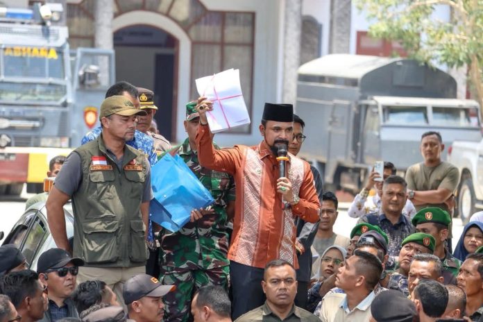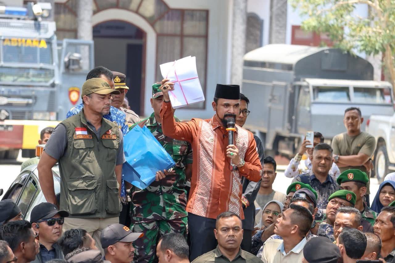 Aceh Timur — Bupati Aceh Timur, Iskandar Usman Al-Farlaky, S.H.I., M.Si., menyambut langsung aksi unjuk rasa yang dilakukan sejumlah masyarakat di gerbang Pendopo Bupati di Idi, Kamis (2/4/2026).