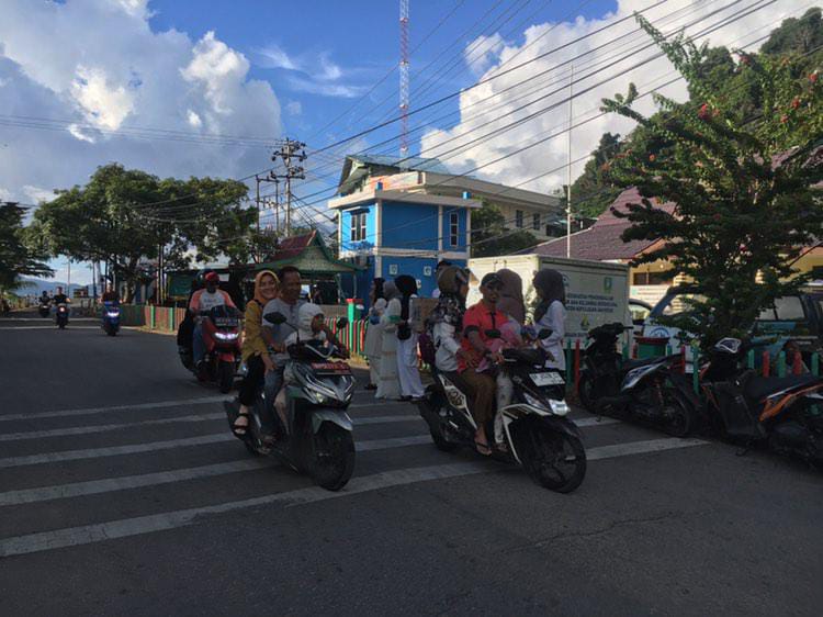 Dengan menggunakan baju nuansa islami warna putih dan penuh kekompakan Sanggar seni Tuah Gemilang mulai membagi satu-persatu takjil kepada pengendara yang melintas tepat di halaman taman bermadah tersebut.