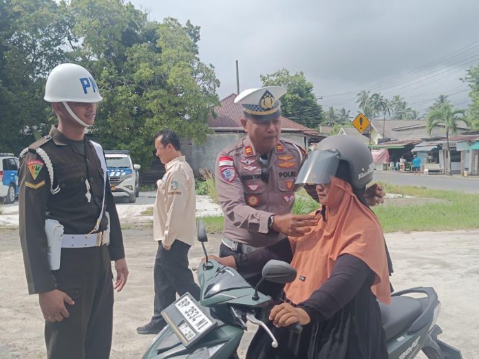 Dalam pelaksanaannya, Kasat Lantas bersama Kepala UPTD PPD Kabupaten Natuna Alpiuzzamari, S.E., perwakilan Jasa Raharja, dan anggota POM TNI membagikan helm kepada pengendara yang belum tertib menggunakan alat keselamatan standar.