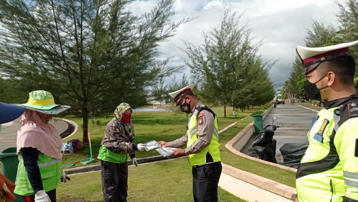 Satuan Lalu lintas (Satlantas) Polres Natuna melaksanakan tugas rutin pengaturan lalu lintas dan juga memberi himbauan protokol kesehatan serta membagikan masker gratis kepada masyarakat di sekitar Pantai Piwang Kecamatan Bunguran Timur, Natuna Kamis (19/08/2021).