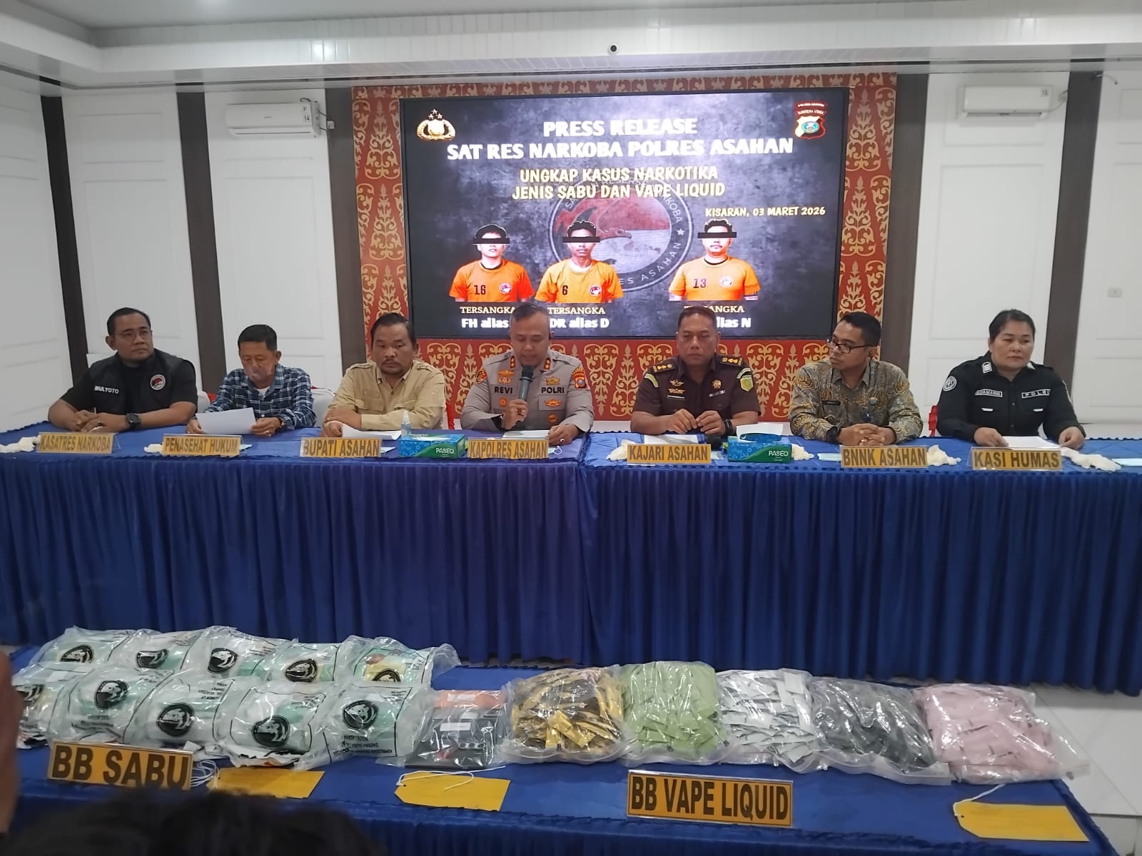 Kapolres memaparkan kronologis penangkapan, yang mana pada hari Jumat, (27/02/2026), sekira pukul 14.00 WIB, Tim Opsnal Sat Res Narkoba Polres Asahan dipimpin oleh Kasat Res Narkoba Polres Asahan berhasil mengamankan 2 (dua) orang laki-laki jaringan peredaran gelap Narkotika yang berinisial DR alias D dan FH alias P, saat ditangkap tersangka sedang berada diatas 1 (satu) unit sepeda motor merk honda ADV warna ungu tanpa nopol, dilakukan penggeledahan badan dan kendaraan ditemukan 10 (sepuluh) bungkus teh Cina warna hijau merk GUAR YUN WANG berisi narkotika sabu brutto 10.000 gram yang berada di dalam jok dan 891 buah cartridge vape merk 7 eleven berisi cairan diduga etomidate berada diatas tangki minyak sepeda motor yang dikendarai oleh FH Alias P.