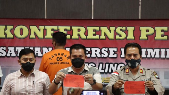 Bursakota.co.id, Lingga – Satuan Reskrim Polres Lingga melakukan Konferensi Pers dalam rangka Pengungkapan kasus tindak Pidana pemerasan yang dilakukan tersangka berinisial E di Gedung Endra Dharmalaksana Polres Lingga, Rabu,(07/09/2022).