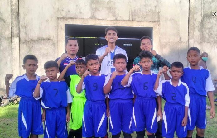 Pelatih futsal SDN 001 Kelarik Air Mali, Maryadi, turut memberikan motivasi kepada para pemainnya.