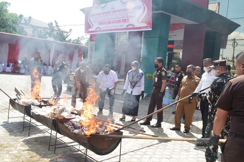 Pemusnahan ini dipimpin langsung Kepala Kejaksaan Negeri (Kajari) Aceh Timur, Dr. Lukman Hakim SH. MH. Barang bukti yang dimusnahkan antara lain, narkotika jenis sabu-sabu seberat 1.022,43 gram, ganja 193,21 gram, pil ekstasi 47 butir, dan sejumlah barang bukti lainnnya.