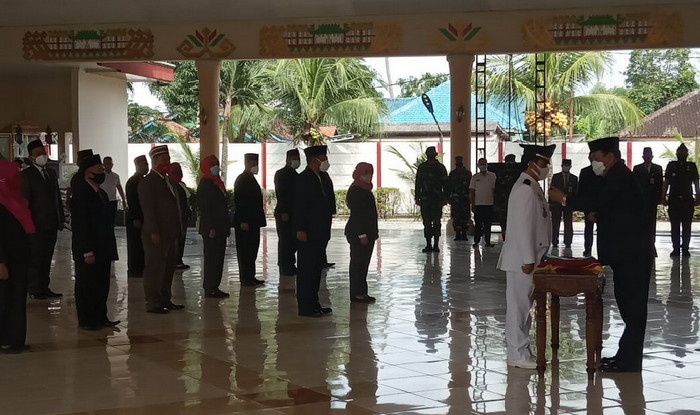 Dalam upacara pelantikan dan pengambilan sumpah jabatan Pejabat Administrator dan Pejabat Pengawas kali ini tetap menerapkan Protokol Kesehatan, memakai masker dan menjaga jarak serta para pejabat yang baru dilantik dipersilakan untuk mengambil SK masing-masing yang telah di persiapkan dimeja pelantikan dengan cara satu persatu.