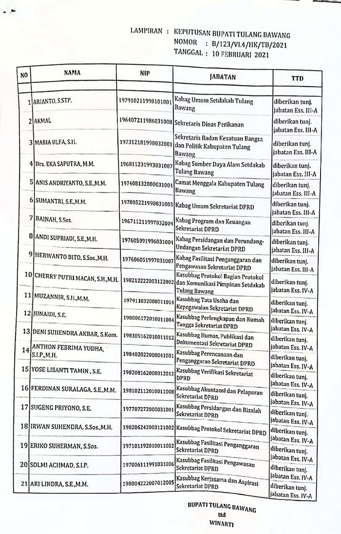 MARIA ULFA .SH. NIP. 197312181998032001 Menjabat Sebagai Sekretaris Badan Kesatuan Bangsa dan Politik Kabupaten Tulang Bawang, diberikan Tunjangan jabatan, III-A. Drs Eka Saputra MM Nip 196811231993031007. Menjabat sebagai, Kabag Sumber Daya Alam Sekda Tulang Bawang, diberikan tunjangan. Jabatan Esselon III-A.