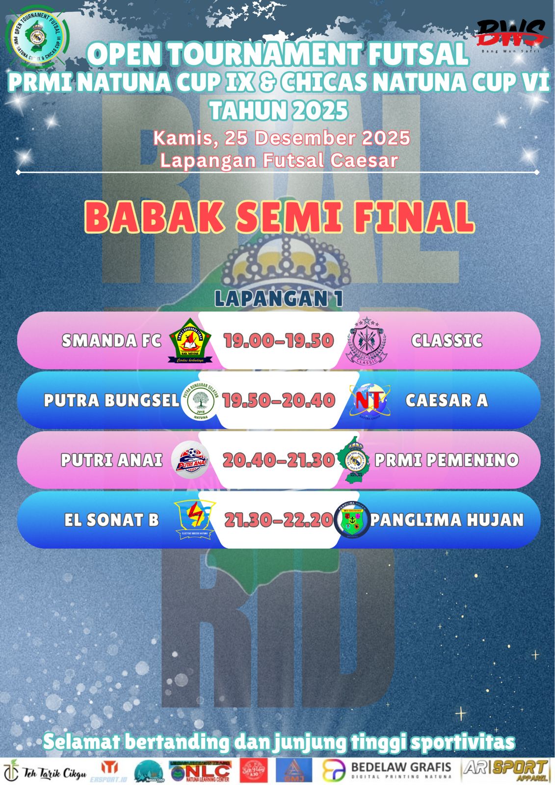 Natuna — Open Turnamen Futsal PRMI Natuna Cup IX dan Chicas Natuna Cup VI Tahun 2025 resmi memasuki babak semifinal.