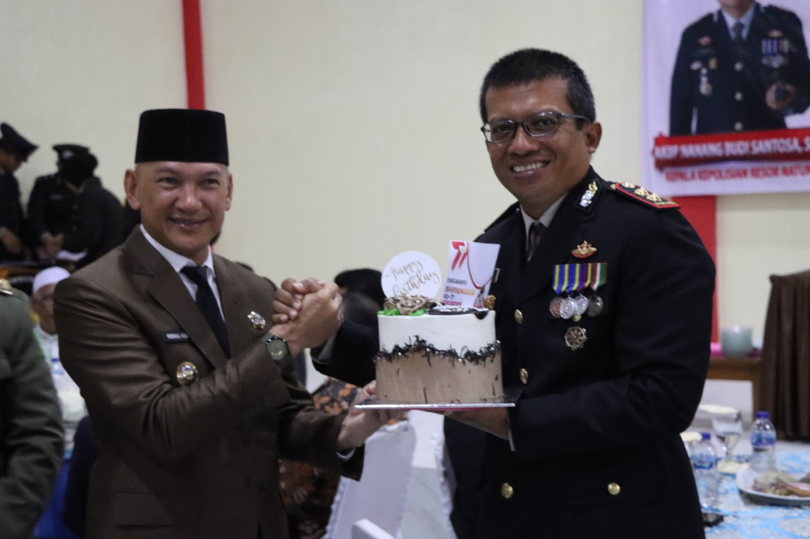 Hari Bhayangkara Ke 77 tahun mengusung tema “Polri Presisi Untuk Negeri, Pemilu Damai Untuk Indonesia Maju”. Selesai upacara dilanjutkan dengan kegiatan syukuran yang di laksanakan di Gedung TRIBRATA Polres Natuna.