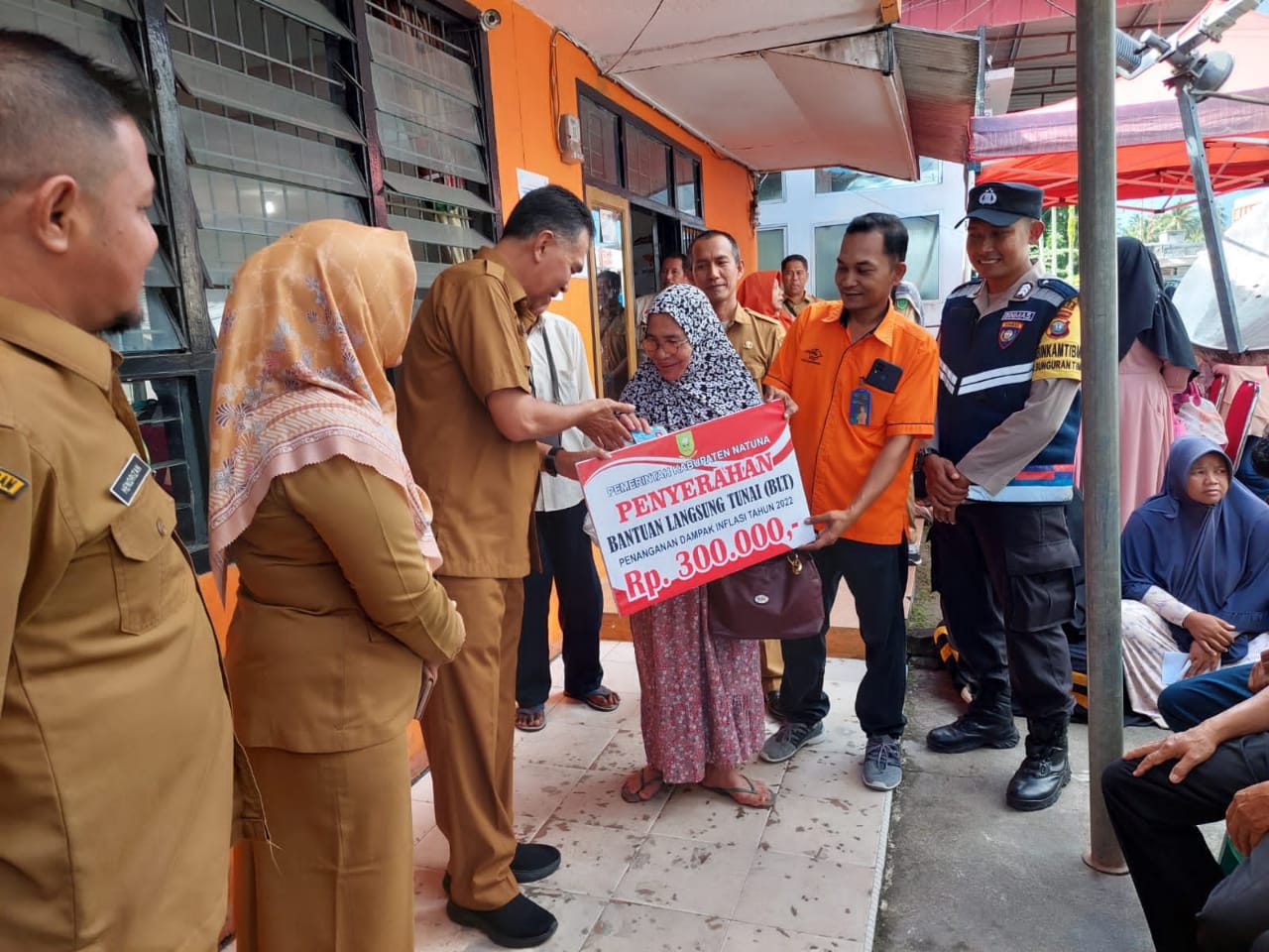 Bursakota.co.id, Natuna – Bupati Natuna Wan Siswandi di dampingi oleh Lurah Batu Hitam, Kepala Dinas Sosial, Babinkantibmas, serta Kepala Pos Ranai menyerahkan secara simbolis Bantuan Langsung Tunai (BLT) bertempat di Kantor Pos Ranai, Senin (28/11/2022).