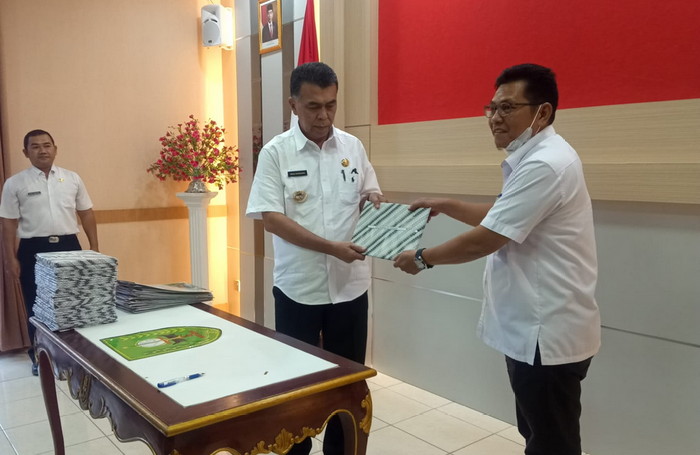 Bursakota.co.id, Natuna – Bupati Natuna, Wan Siswandi, melakukan menyerahkan Dokumen Pelaksanaan Anggaran (DPA) ke masing-masing Organisasi Perangkat Daerah (OPD) dilingkungan Pemerintah Daerah Kabupaten Natuna untuk tahun anggaran 2022, di Ruang Rapat Lantai II Kantor Bupati Natuna, Bukit Arai, Rabu (12/01/2022) siang.