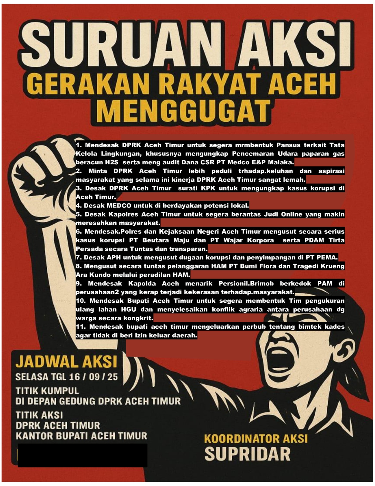 Aceh Timur – Massa aksi yang menamakan dirinya ‘ Gerakan aceh menggugat ‘ bakal menggelar aksi demonstrasi di depan kantor DPRK, kantor bupati Aceh Timur, Selasa 16/9/2025, menuntut penegak hukum mengusut tuntas kasus korupsi ,CRS PT MEDCO dan upaya penghambur – hamburan milyaran dana desa di luar desa, dan menghentikan kegiatan study tour aparat desa di setiap tahun ke luar daerah