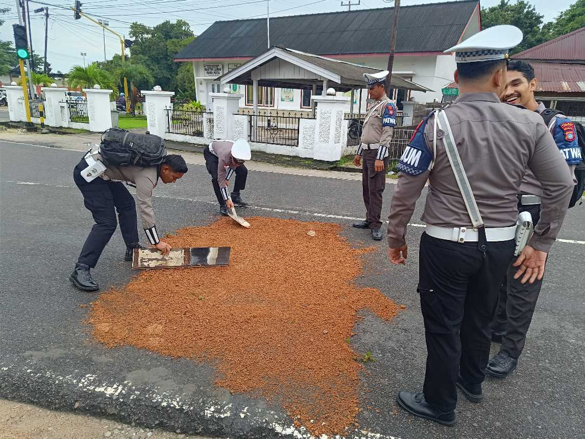 “Begitu menerima laporan, anggota langsung bergerak ke lokasi untuk membantu korban dan mengamankan situasi. Kami juga lakukan penanganan di TKP dengan menabur pasir agar permukaan jalan tidak licin dan tidak membahayakan pengendara lain,” ujarnya.