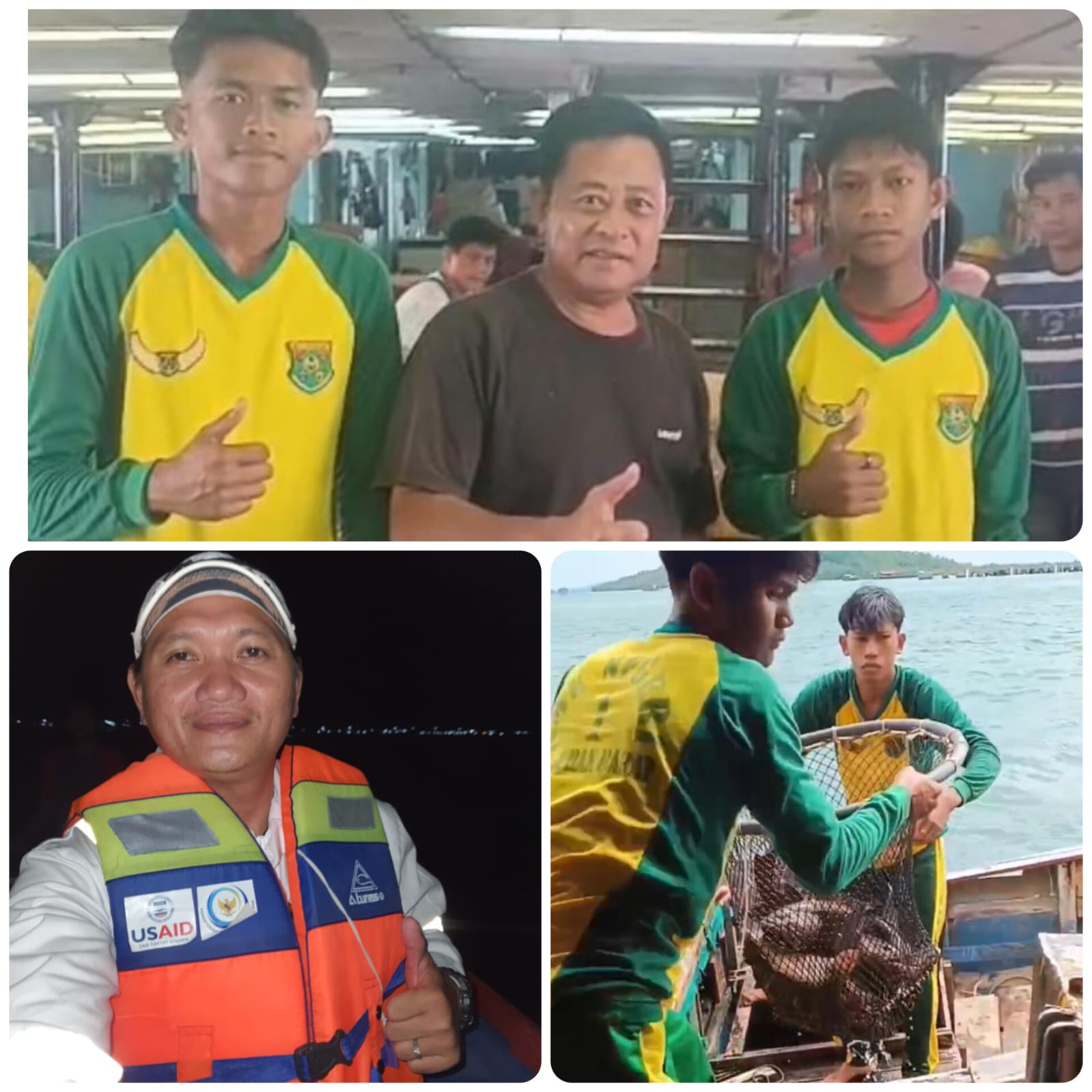 Foto kolase Kepala Sekolah SMKN1 Bunguran Barat, Kasyifal Ghammi Thaib dan proses pengangkatan ikan kerapu dan sunu ke kapal hongkong dan siswa SMKN 1 Bunguran Barat bersama pengusaha Sedanau, Nato