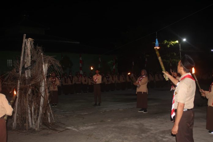 Natuna – SMP Nurul Jannah Natuna menggelar upacara penyalaan api unggun pada malam terakhir perkemahan dalam rangka memperingati Hari Pramuka ke-64.