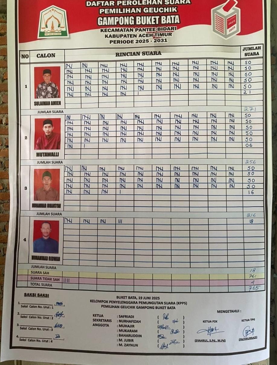 Aceh Timur – Kamis, 19 Juni 2025 Pemilihan Kepala Desa (Geuchik) Gampong Buket Bata, Kecamatan Pantee Bidari, Kabupaten Aceh Timur, telah selesai digelar dengan sukses dan damai.