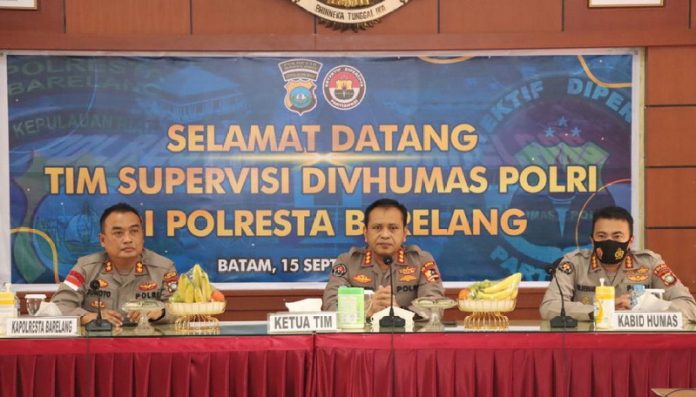 Bursakota.co.id, Batam – Tim Supervisi Fungsi Teknis Kehumasan dari Divisi Humas Polri mengunjungi Polresta Barelang, hadir dalam kegiatan tersebut Ketua Tim Supervisi Divisi Humas Polri Kombes Pol Drs. Sumarto, M.Si beserta Tim, didampingi Kabid Humas Poda Kepri Kombes Pol Harry Goldenhardt S., S.IK., M.Si, Wakapolresta Barelang, Kasihumas Polresta Barelang, dan para peserta Supervisi, Kamis (15/9/2022).
