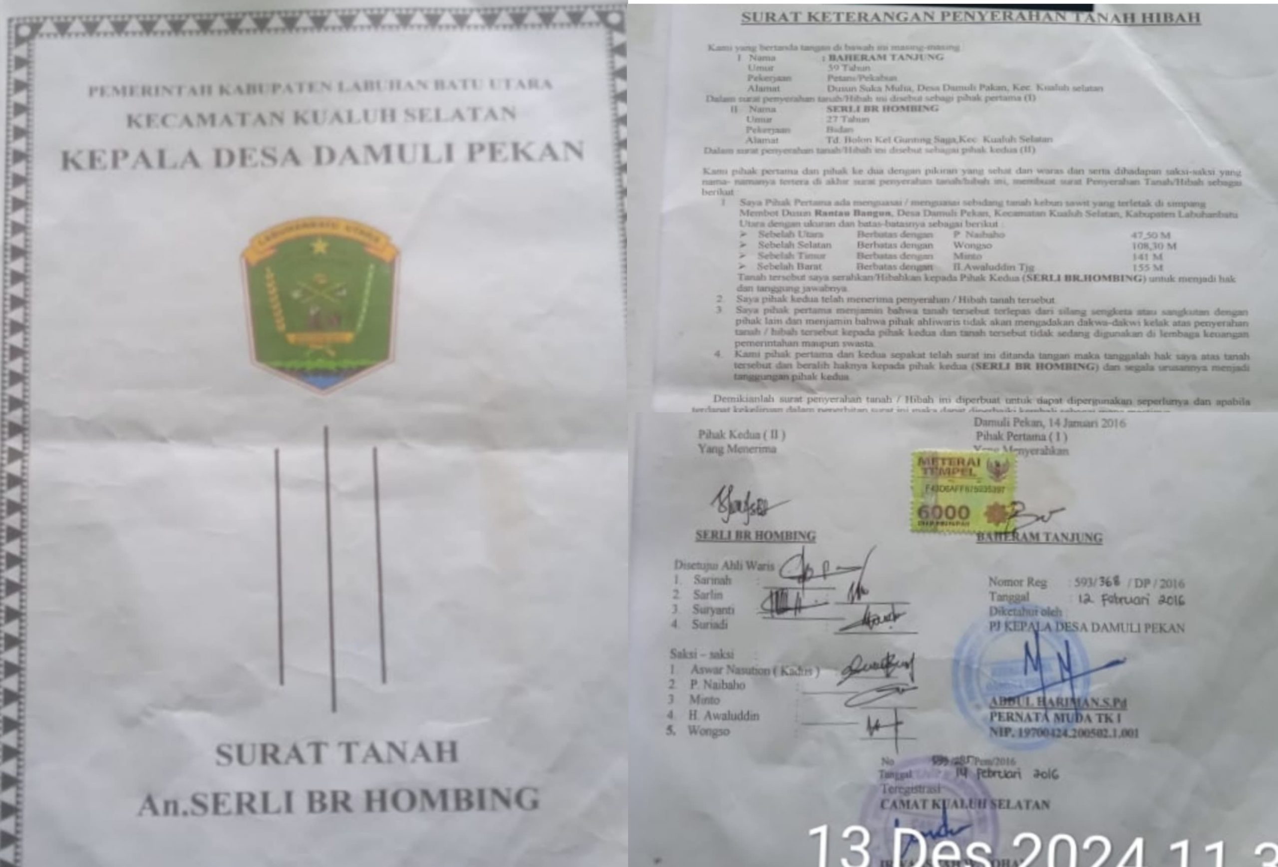 Kronologi surat tanah tersebut sebagai berikut, Surat tanah hibah yang isinya sebidang tanah diserahkan oleh Orangtua bernama Baheram Tanjung alias BT, ke Serli br Sihombing alias SS sebagai anak kandung, dengan para saksi Ahli Waris bernama Sarinah, Darlin, Suryanti, Suriadi. Sementara sebagai saksi sekitar atau sepadan antara lain, Aswar Nasution selaku Kepala Dusun (Kadus), P Naibaho, Minto, H. Awaluddin, dan wongo.
