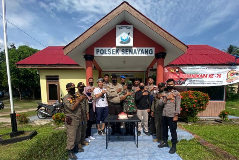 “Selamat Hari Bhayangkara ke-76 Semoga Polri semakin PRESISI (prediktif – responsibilitas – transparansi – berkeadilan) dalam menjalankan tugas sebagai Pelindung, Pengayom dan Pelayan Masyarakat,” ucap Camat Senayang diikuti para Sraf dengan menyodorkan sebuah kue ulang tahun pada Jum’at. 01/07/2022 di Kantor Polsek Senayang.